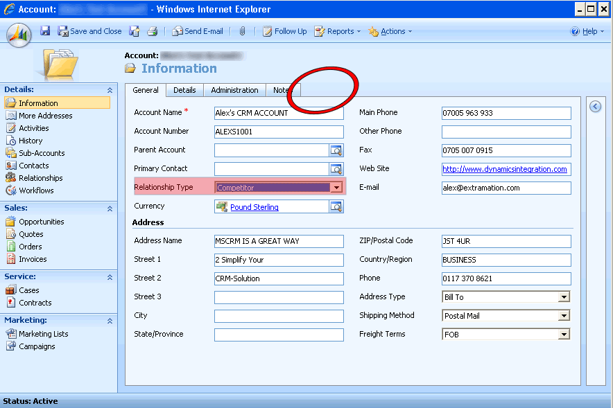The screenshot below depicts the CRM Account entity. The tab labelled "Hide Me" circled in red will be made invisible when we change the "Relationship Type" of the customer to either "Competitor" or "Consultant".